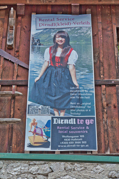 Angesichts so vieler Schaufeln, Sägen, bei so viel rollendem Gerät an der Außenhaut des Hauses: vielleicht ein extrovertiertes Handwerker- oder Bauernmuseum? Es ist nicht nur die kühne Steilheit von üppig bewachsenen Hängen und häuslichen Fassaden, die in Hallstatts Seestraße bewundernde Aufmerksamkeit einzufordern weiß - allüberall lauern ganz verblüffende Details, die die Sinne mobilisieren. Zum Beispiel das fesche "Dirndl to go", das freundlich um Leihnahme